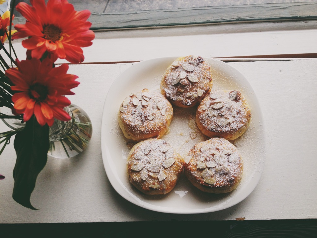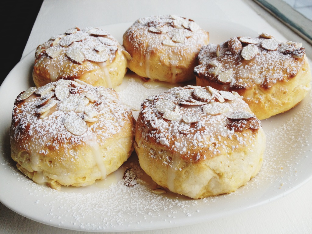 Let them cool on a plate. Once they are somewhat cool, open a can of Sweetened Condensed Milk and drizzle it over the tops. Sprinkle slivered almonds on the gooey stuff. (if the buns are too warm still, it will all melt off the tops, and land on your plate. Learn from my failures of past)