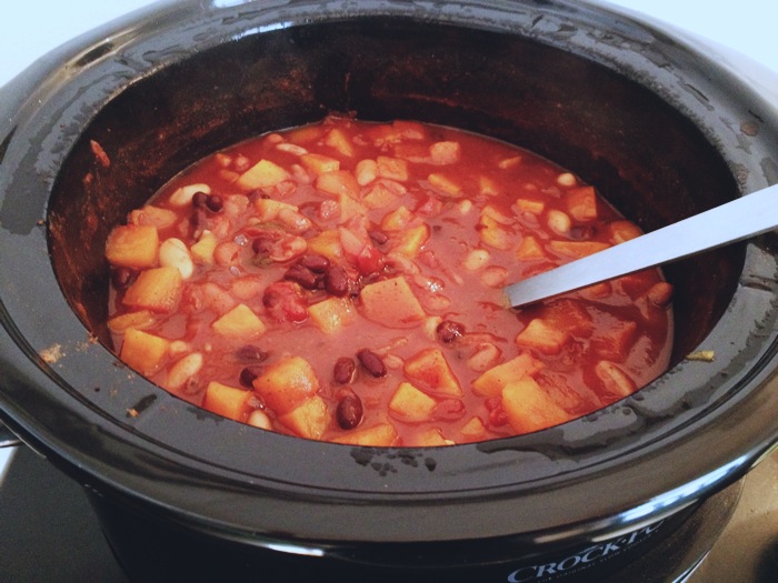 While it’s snowing, I’m cozy in my living room, sharing my new Crock-Pot Sweet Potato Chili recipe. How appropriate!