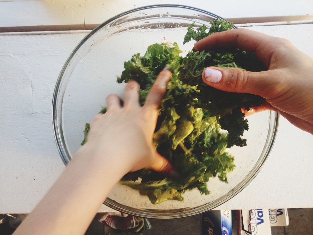 First, wash a couple bundles of kale and try to remove as much of these thicker stems as you can, like rip the leafs off. Big, small…doesn’t matter.