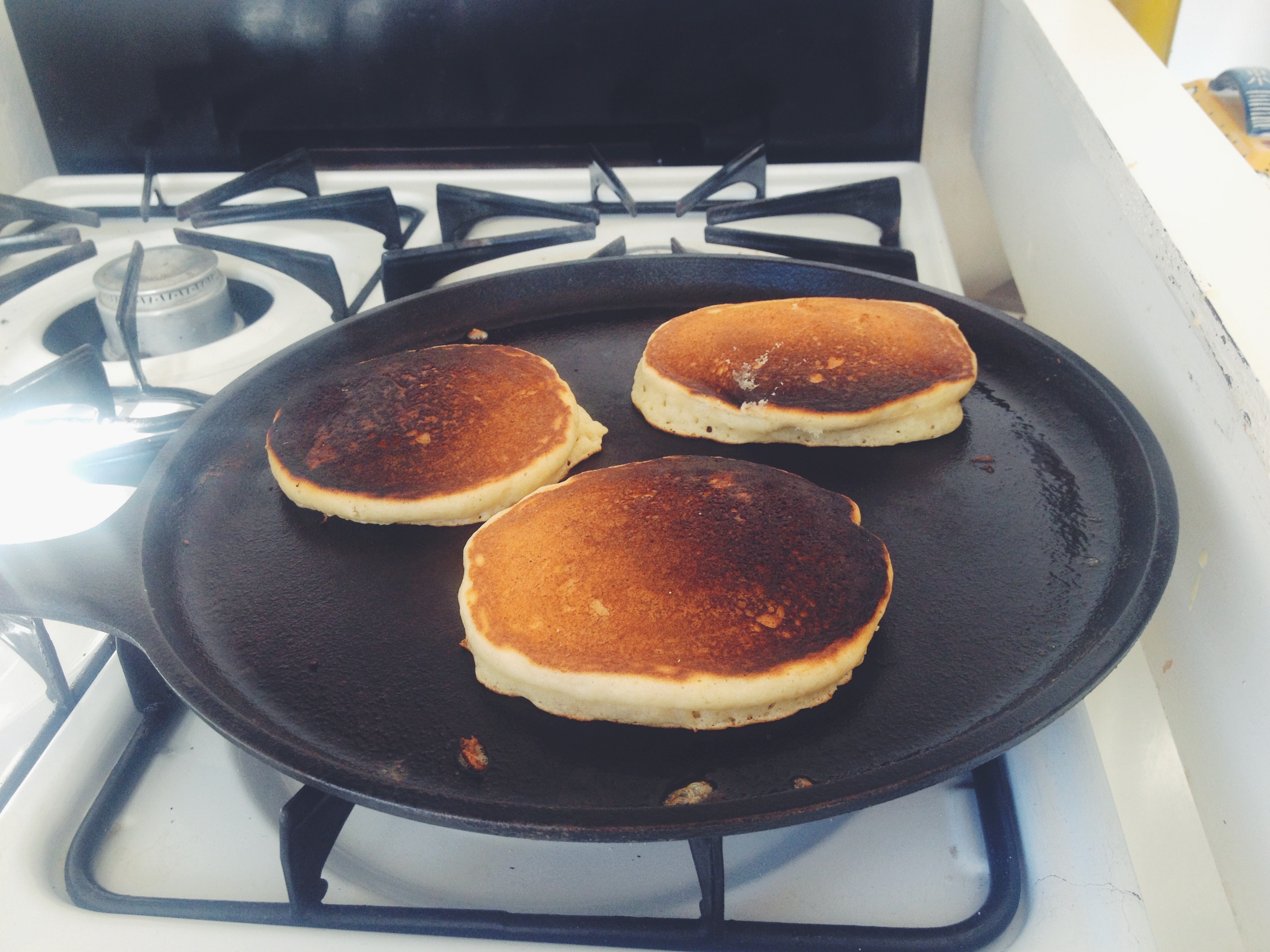 Separately, mix the dry ingredients and the wet ingredients. Then combine them. Place an iron skillet or regular frying pan on the stove over medium heat. Grease with butter or coconut oil. I then use my 1/4 measuring cup to scoop out a heaping, perfectly sized pancake. I recommend cooking on low-medium heat to prevent burned outsides and gooey insides. This batch was a bit well-done as you can see, but they still tasted too legit to quit.