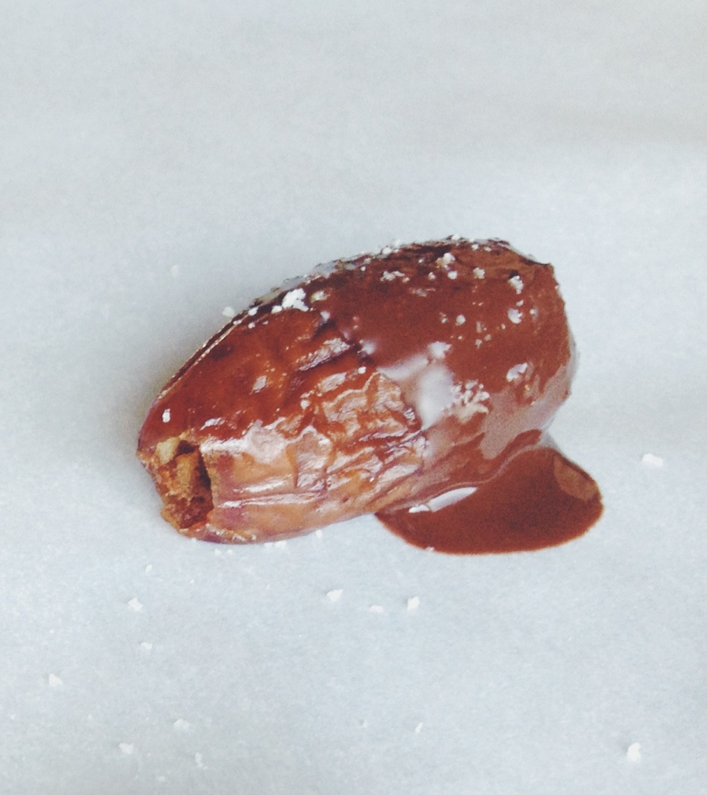 Ok. Set out your parchment paper. Dip the date in the chocolate. Place on parchment. Sprinkle with that pretty pretty Celtic Sea Salt, and set them in the fridge to cool for about 10 minutes.