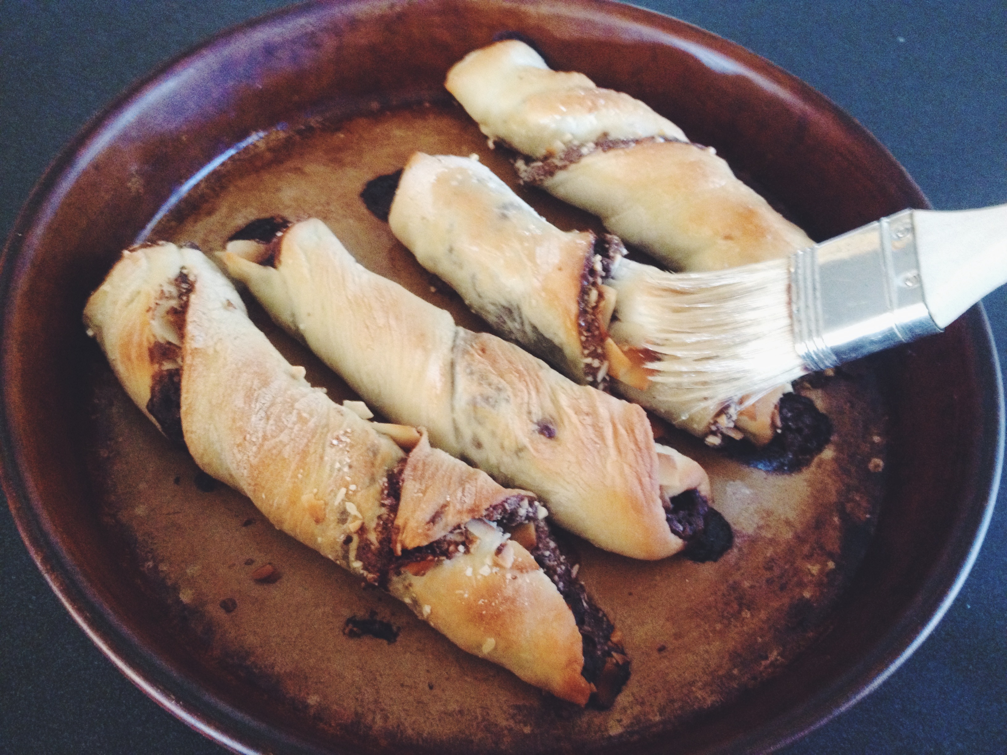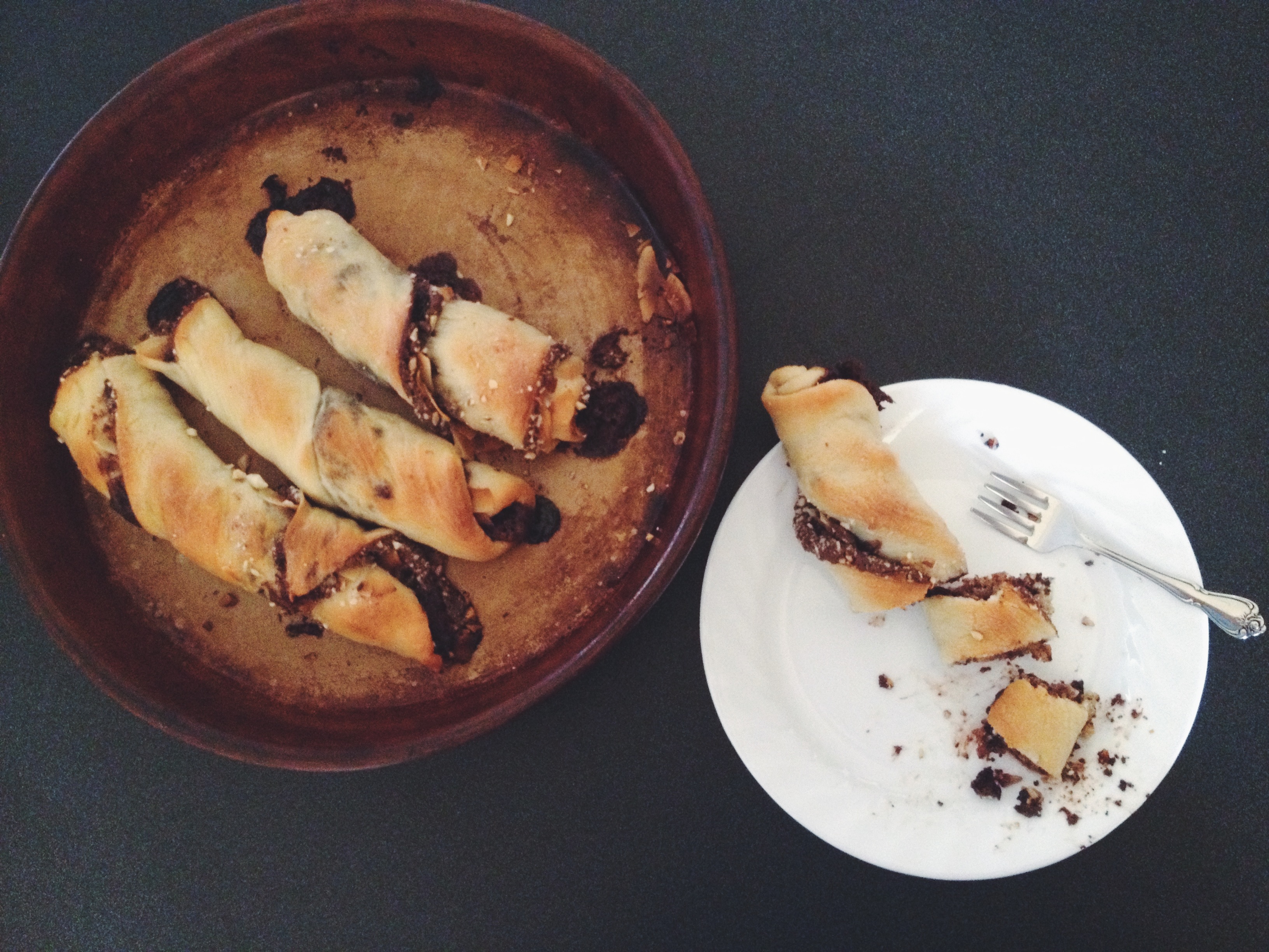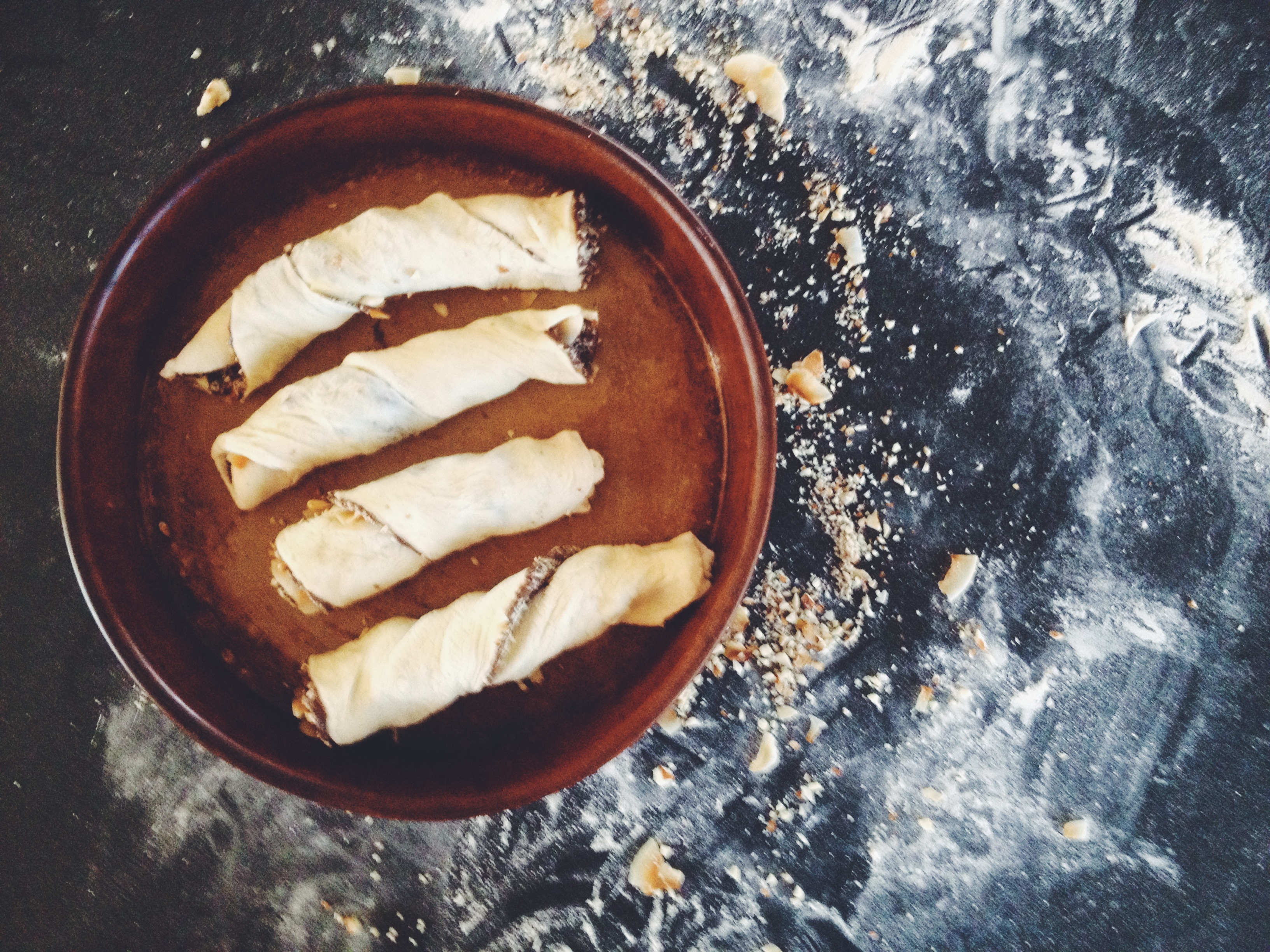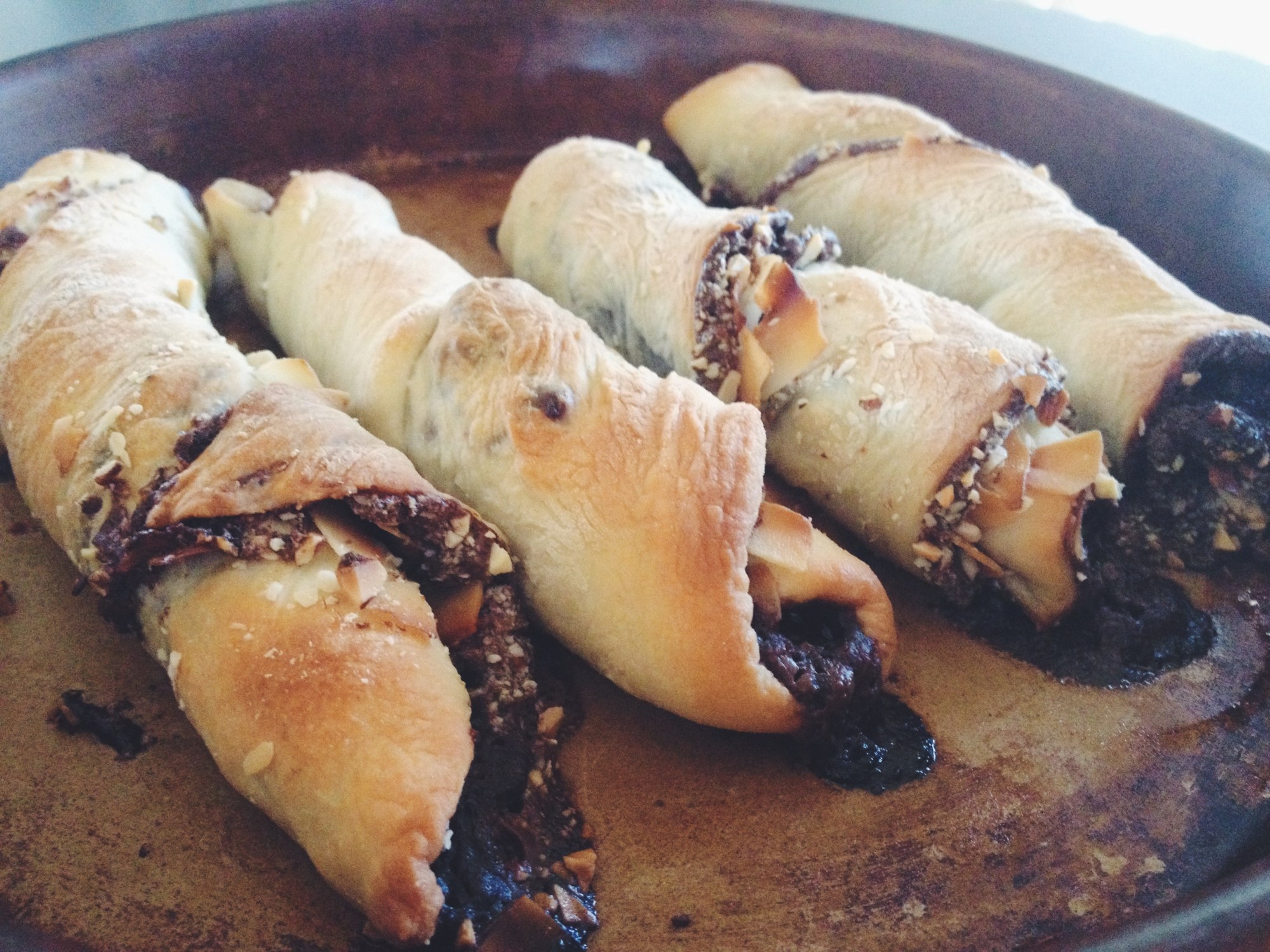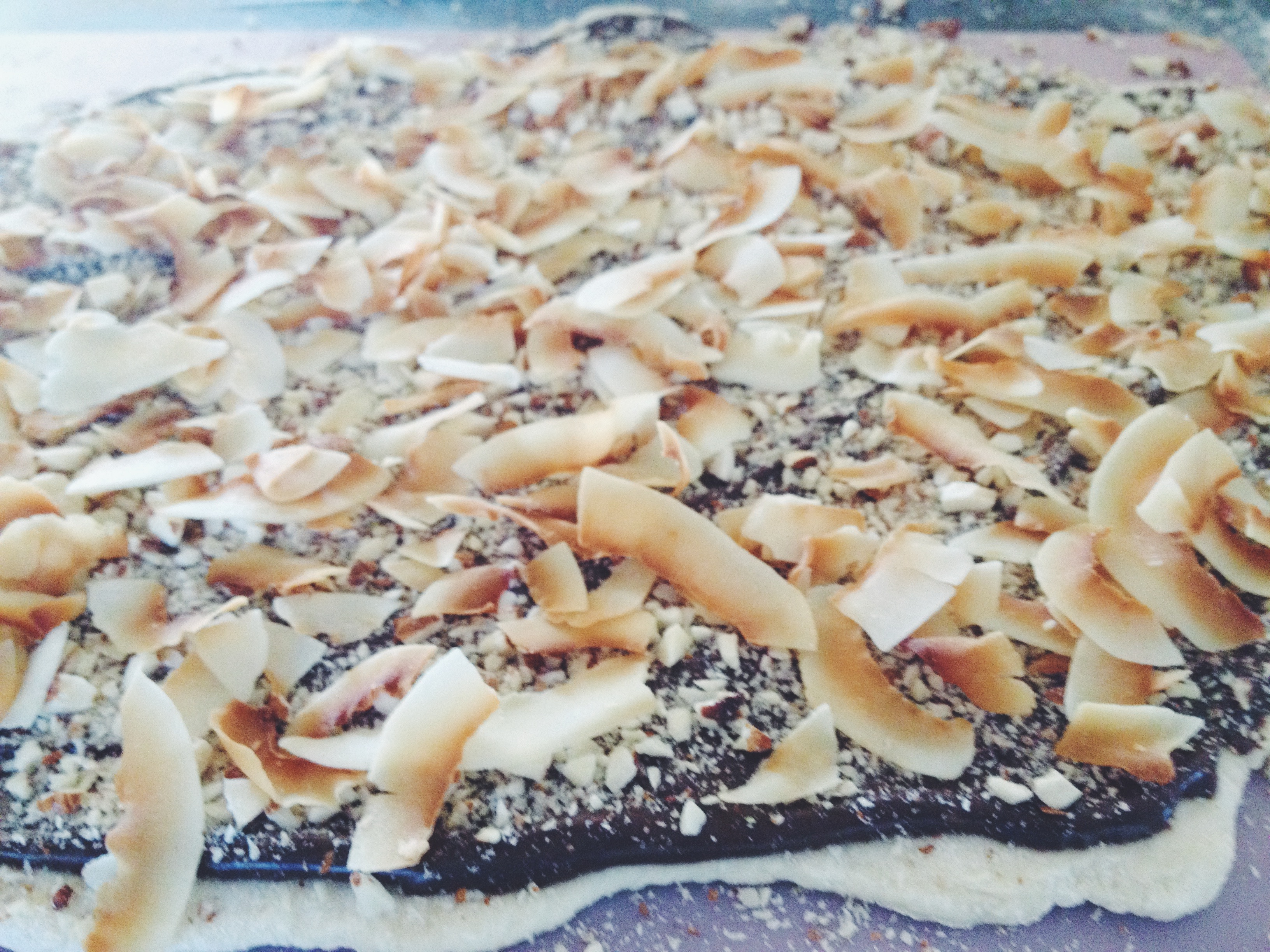 On how I formed the rolls: after I spread the chocolate and sprinkled with coconut and almonds, I sliced it about 4 ways, rolled each, and twisted them in the motion of how you ring out a wet washcloth. Does that make sense? Because I don’t know how else to explain it.