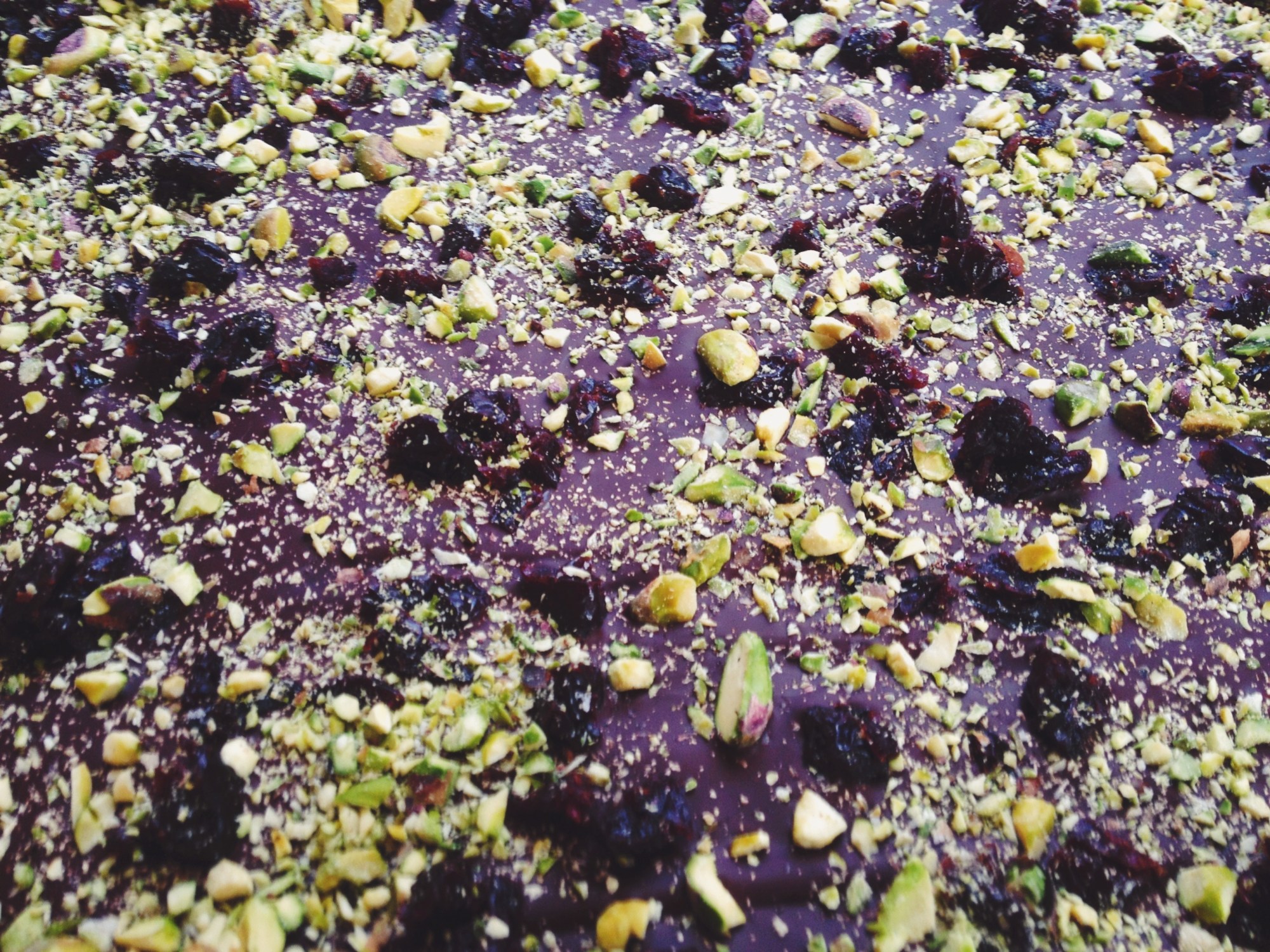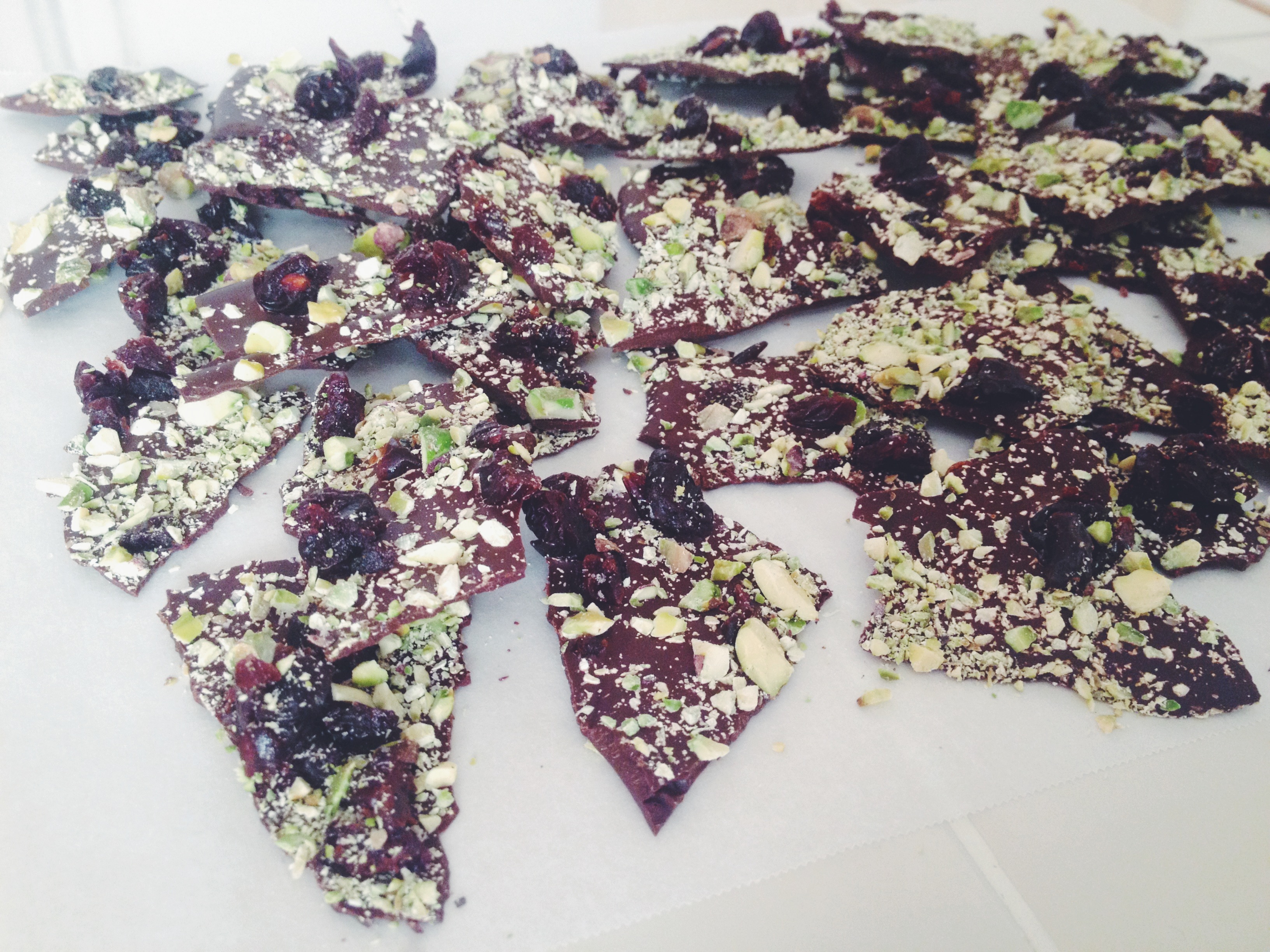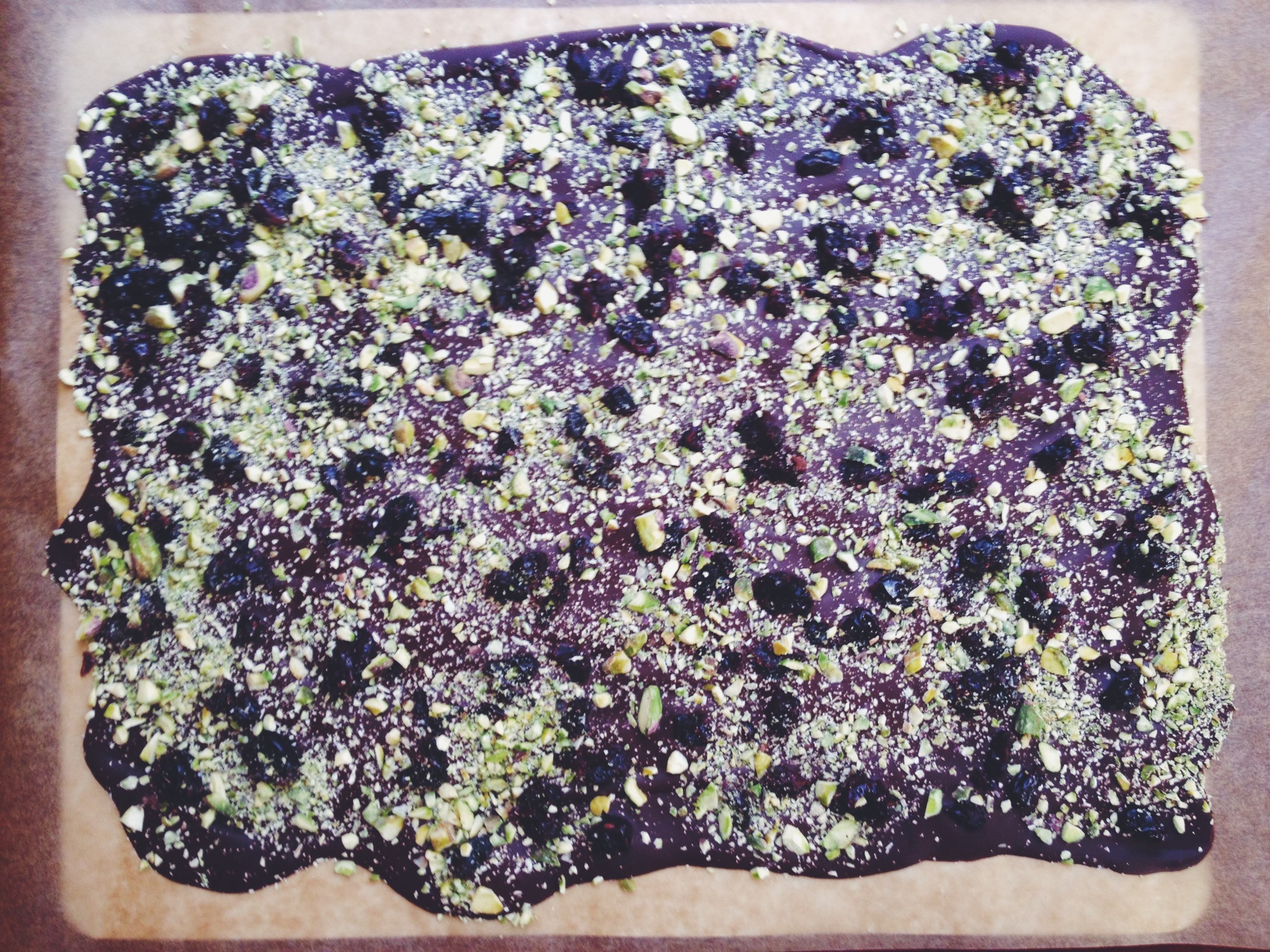 Anyway, I’ve got to share with you, a fancy treat I made last week! This is what it entails: melting chocolate, sprinkling it with your fav’s, and letting it set.