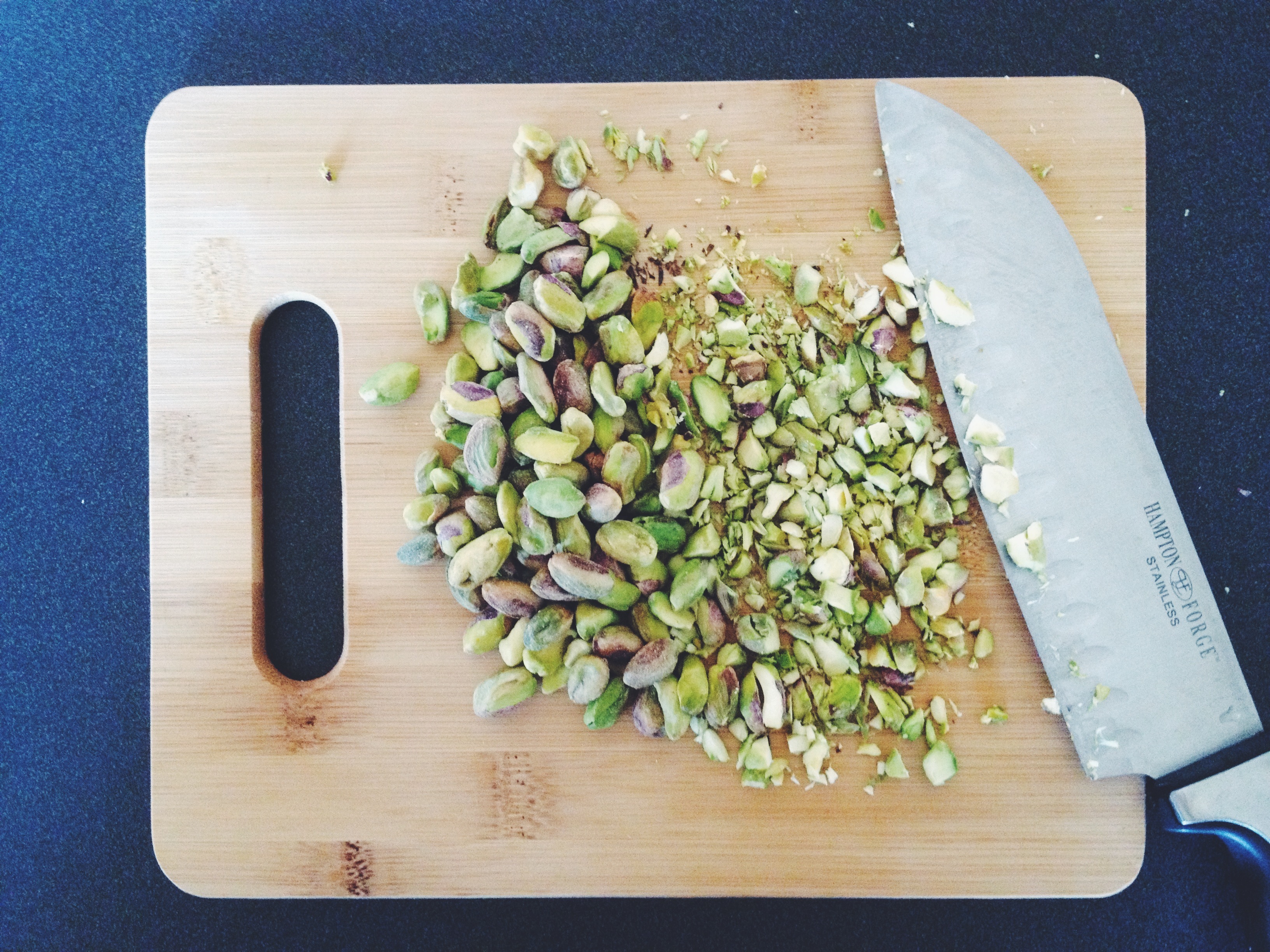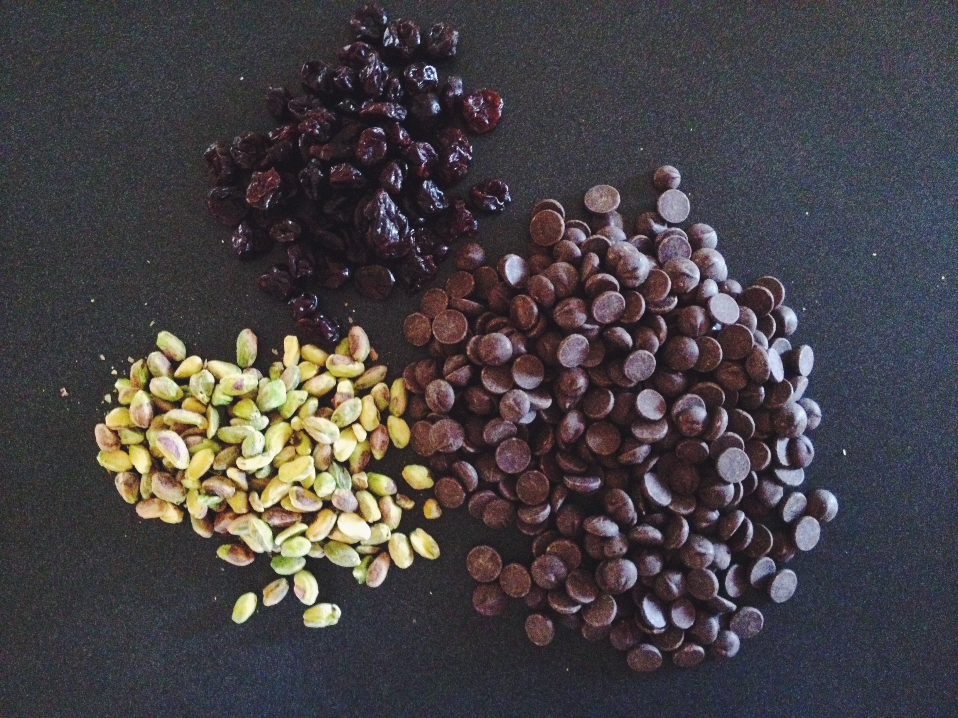 Sprinkle the pistachios and cherries. (since my pistachios were raw, I sprinkled on a tiny pinch of celtic salt too)