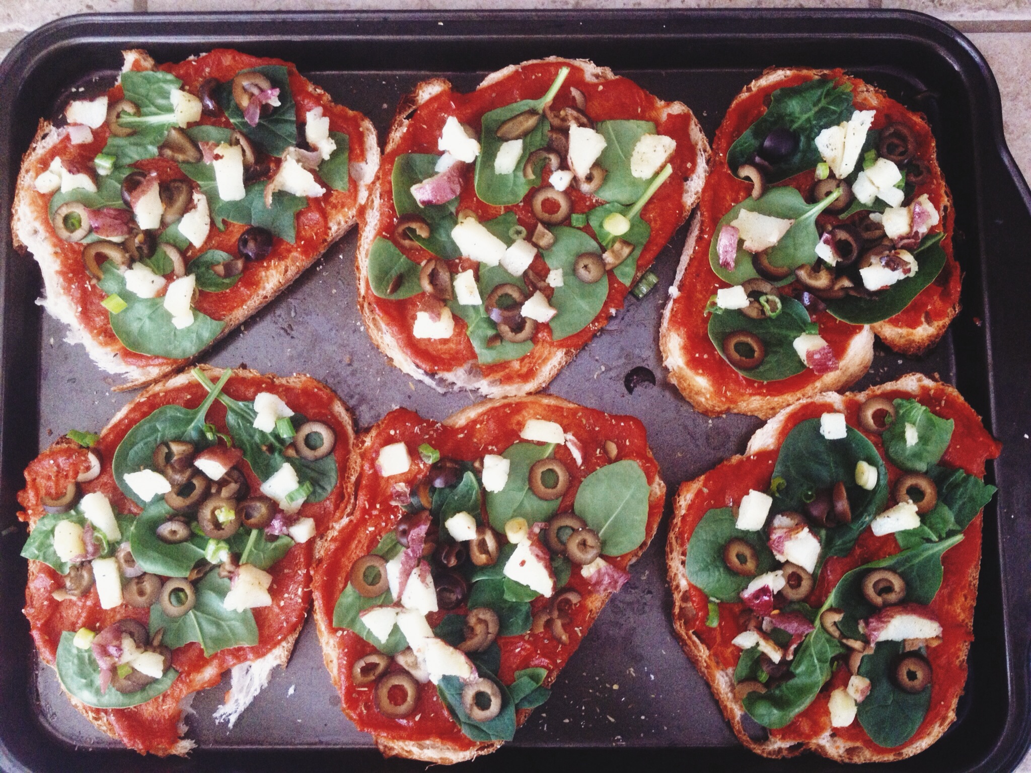 This one requires nothing more than a roll of french bread, pizza toppings, less than 5 minutes under the broiler in your oven. Fast and furious.