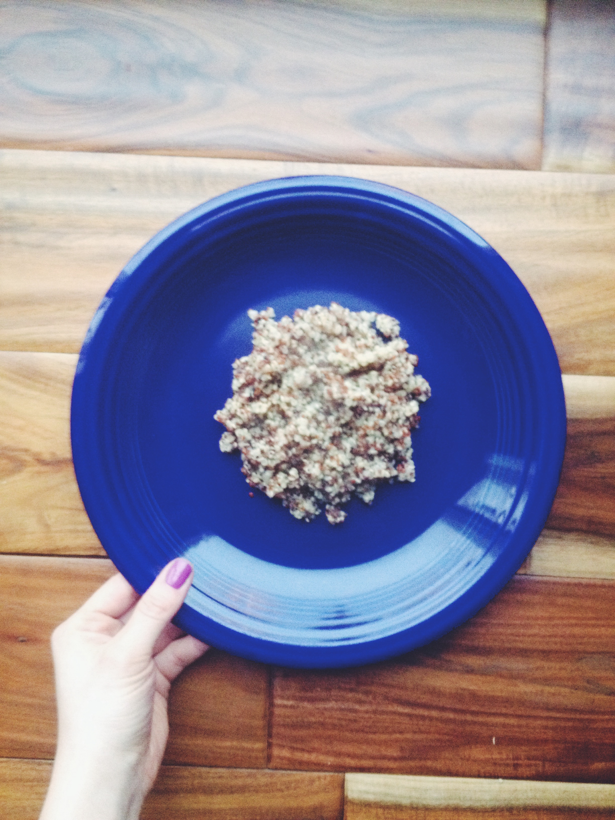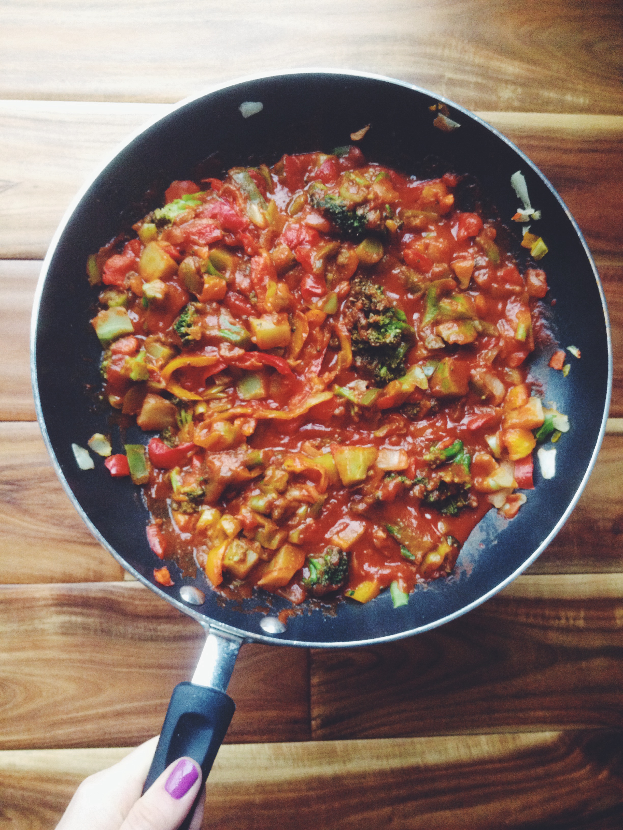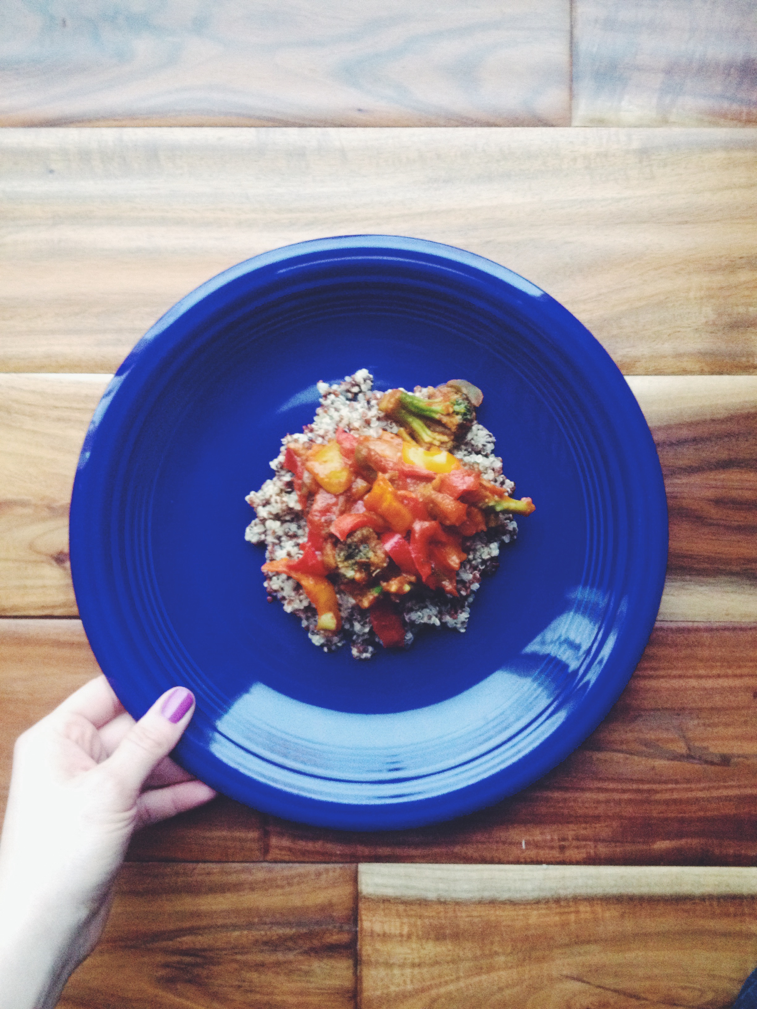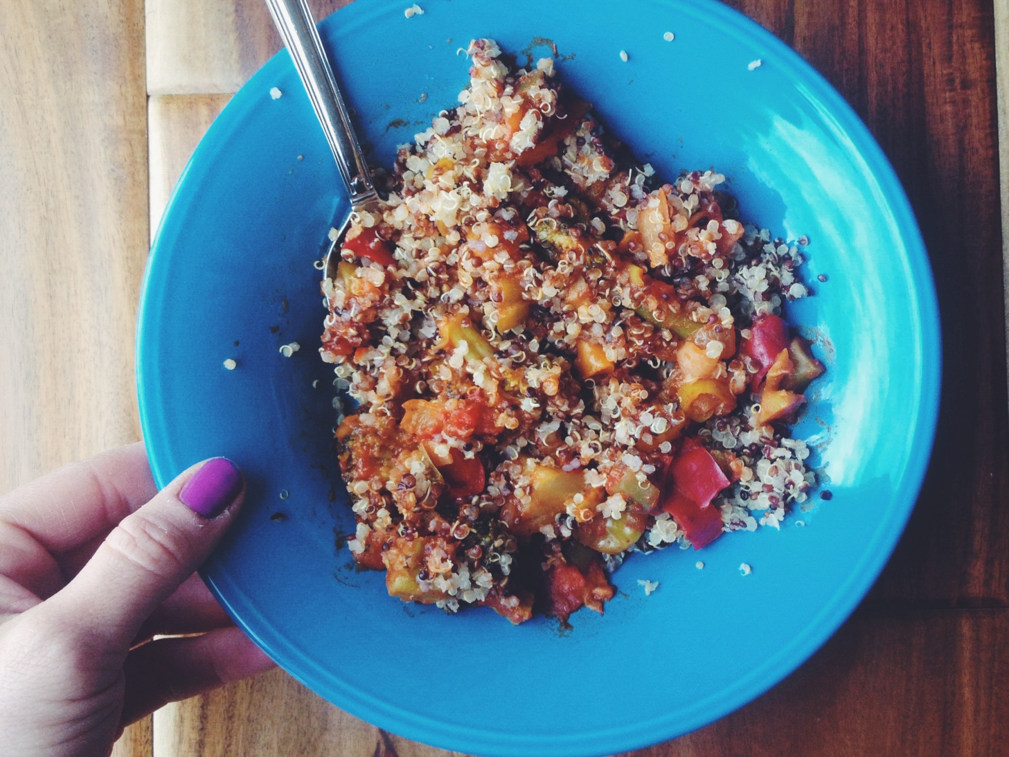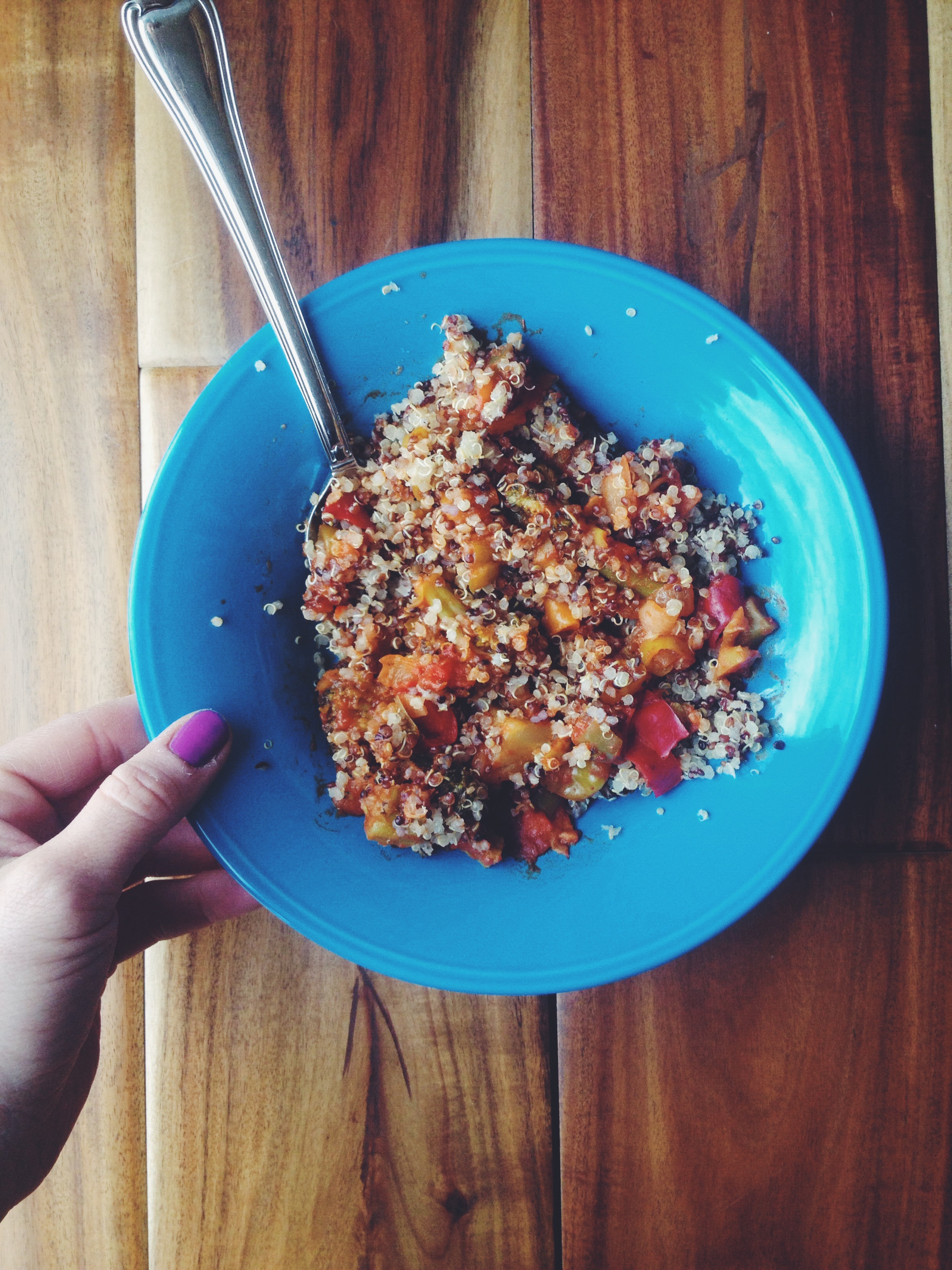 Saute your vegetables in butter or oil. Separately cook turkey sausage. Separately prepare quinoa, with a little salt added. (or rice! I just prefer quinoa).