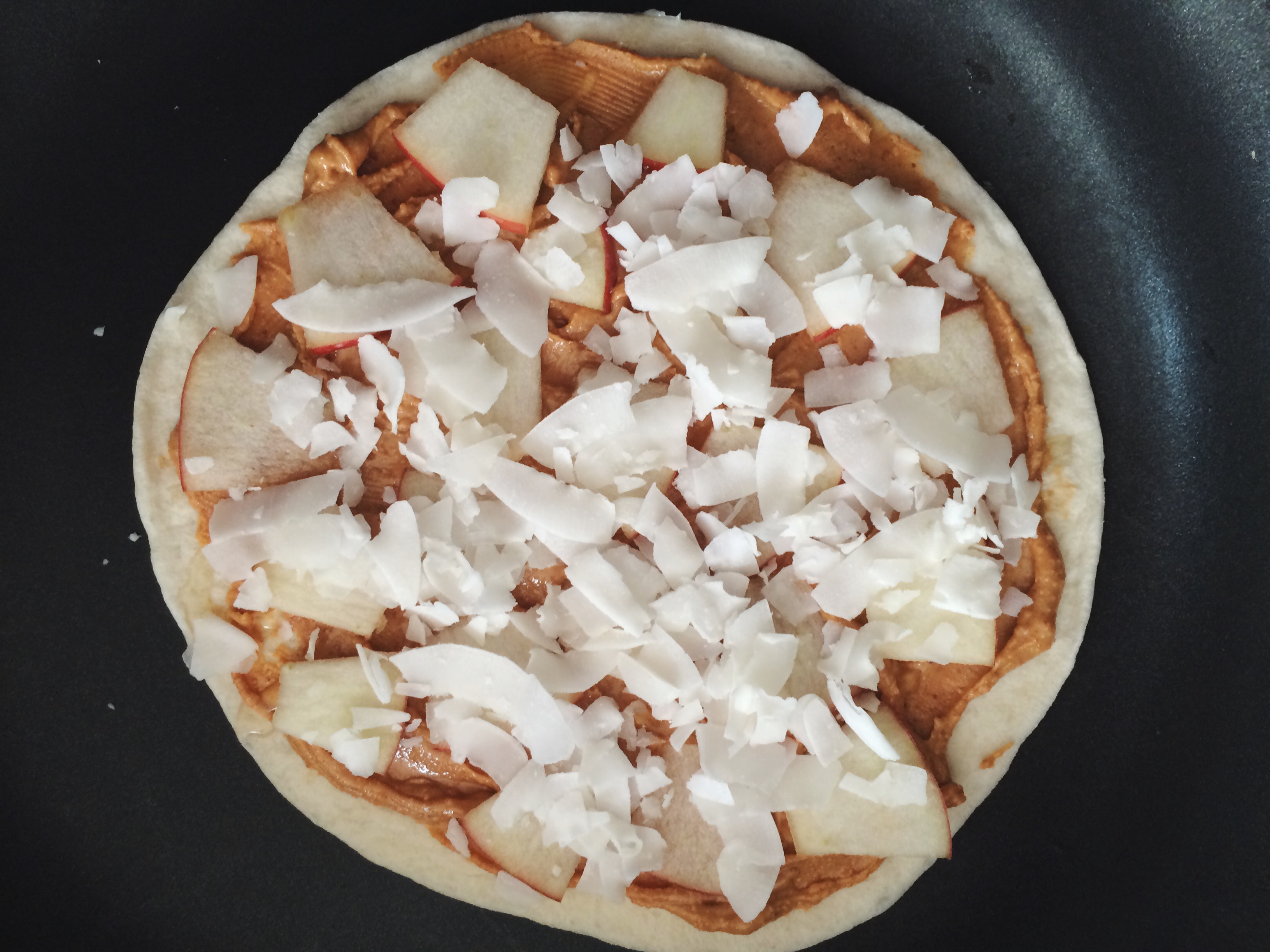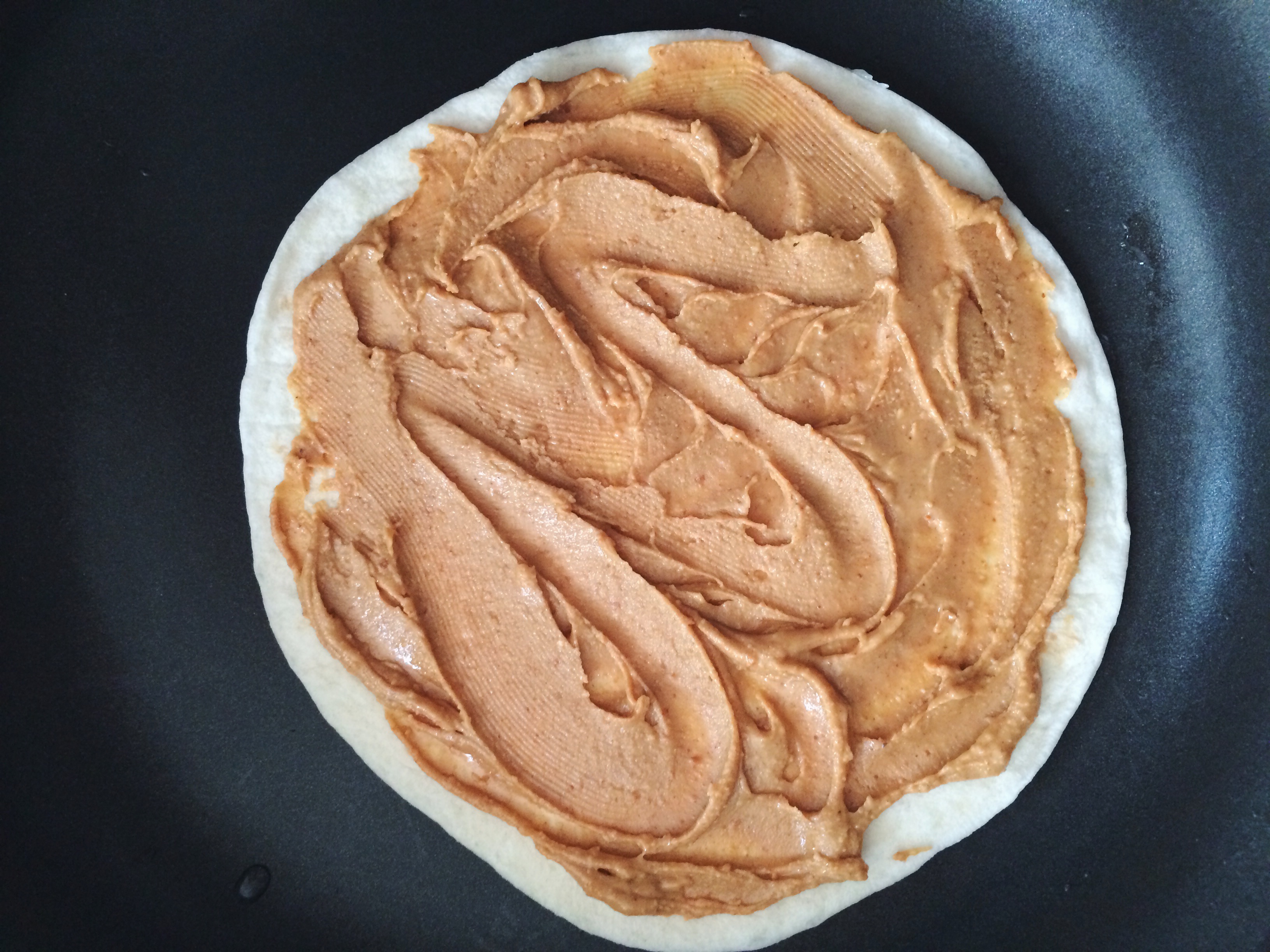 Take two tortilla shells. Butter 1 side of each. Place one of them, butter side down, on a stove top pan. Smother it with 2 TBSP Peanut Butter. Justin’s is a favorite, here.