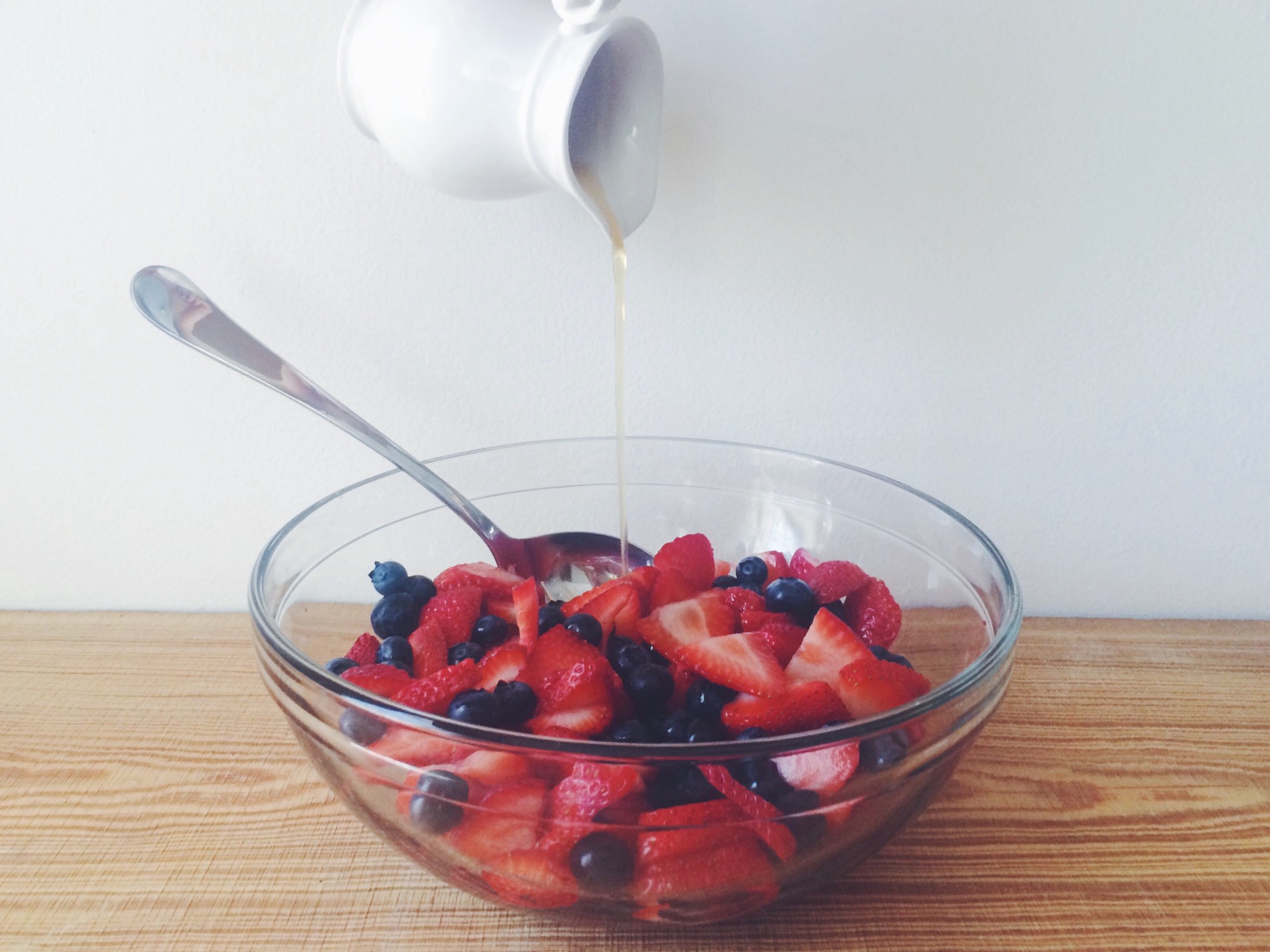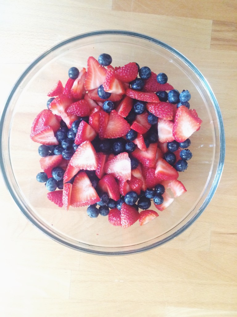 Chop the starberries into bite size, and mix together with the blues in a large bowl.