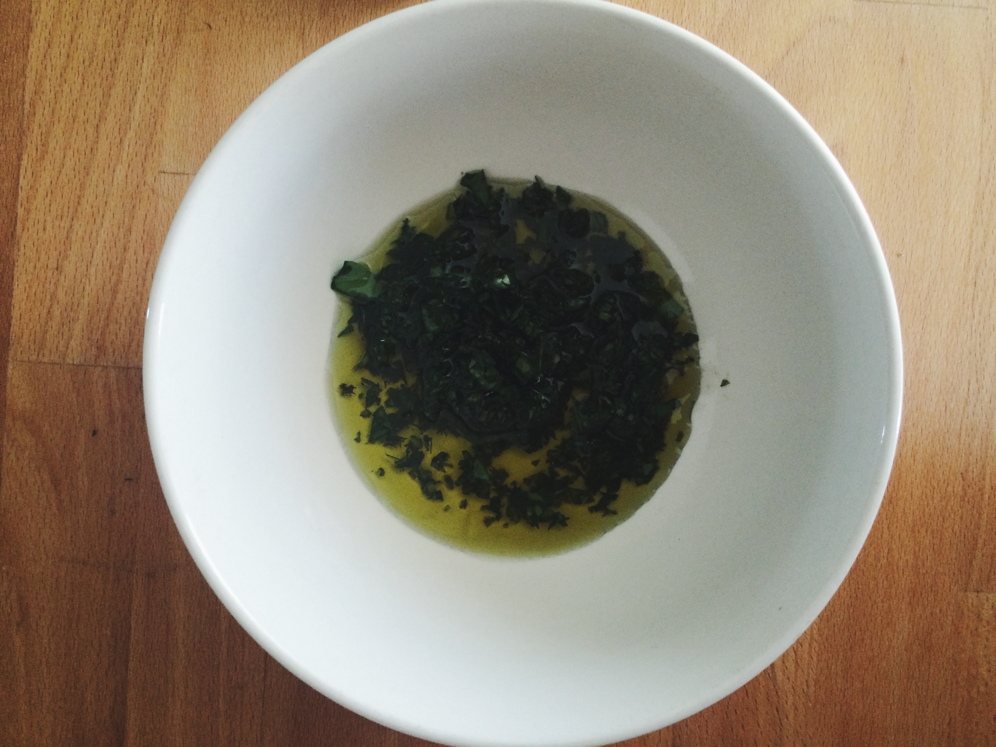 Start with plucking a big handful of basil leaves. Cross-chop it up. The longer you go, the finer it’ll get.