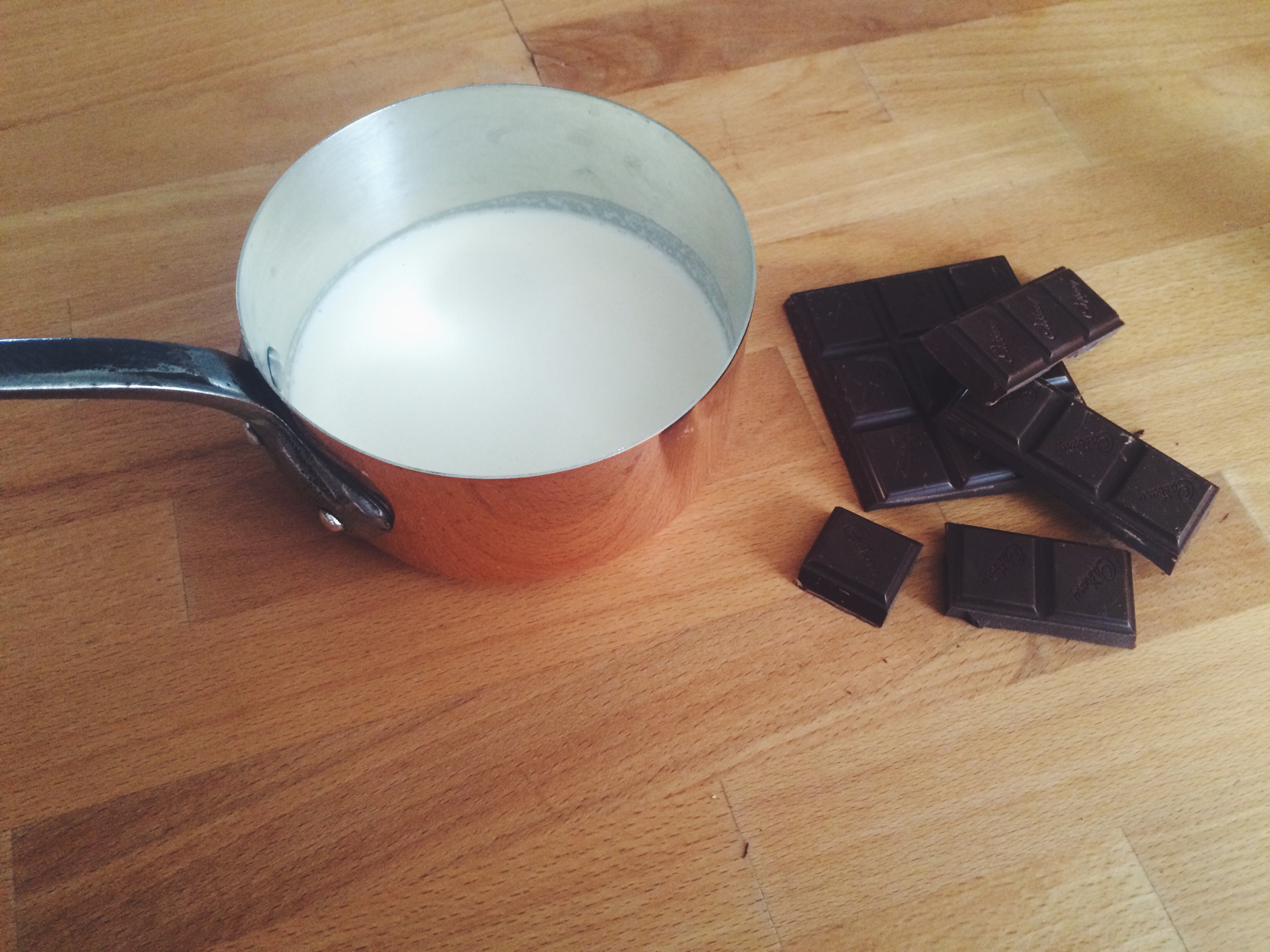 Bring cream to a boil on the stove top. Try to turn off the fire as soon as it starts bubbling. Immediately pour over the chocolate and leave it alone for 10 minutes. Don’t stir yet! Texture perfection depends upon it.