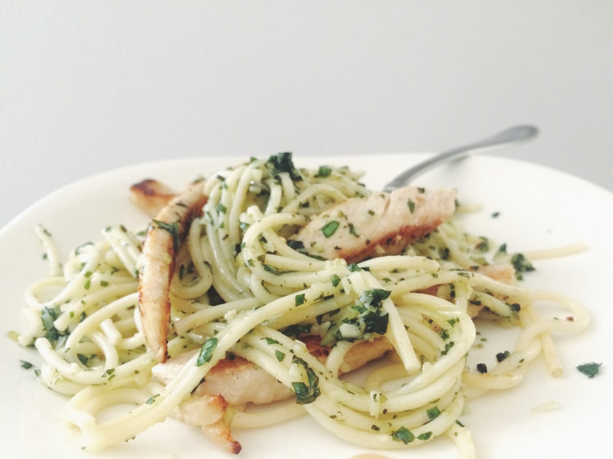 While the chicken is cooking you get get to work on the fun part…Almond Parmesan Pesto. Get creative with quantities, and use a food processor if you prefer not to chop!