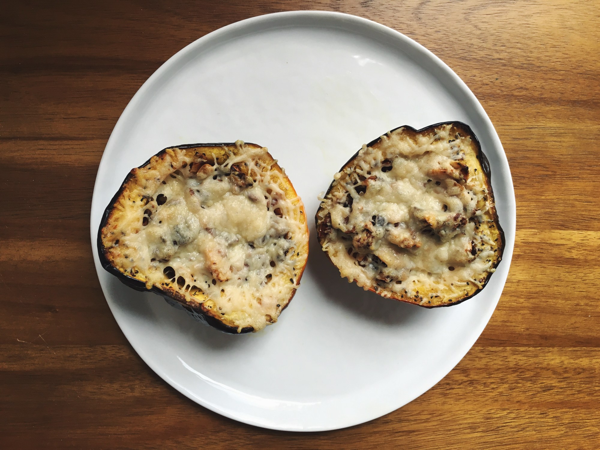 2 Acorn Squash (sliced in half, baked at 400 for 40-45 min, face up brushed with olive oil, salt)