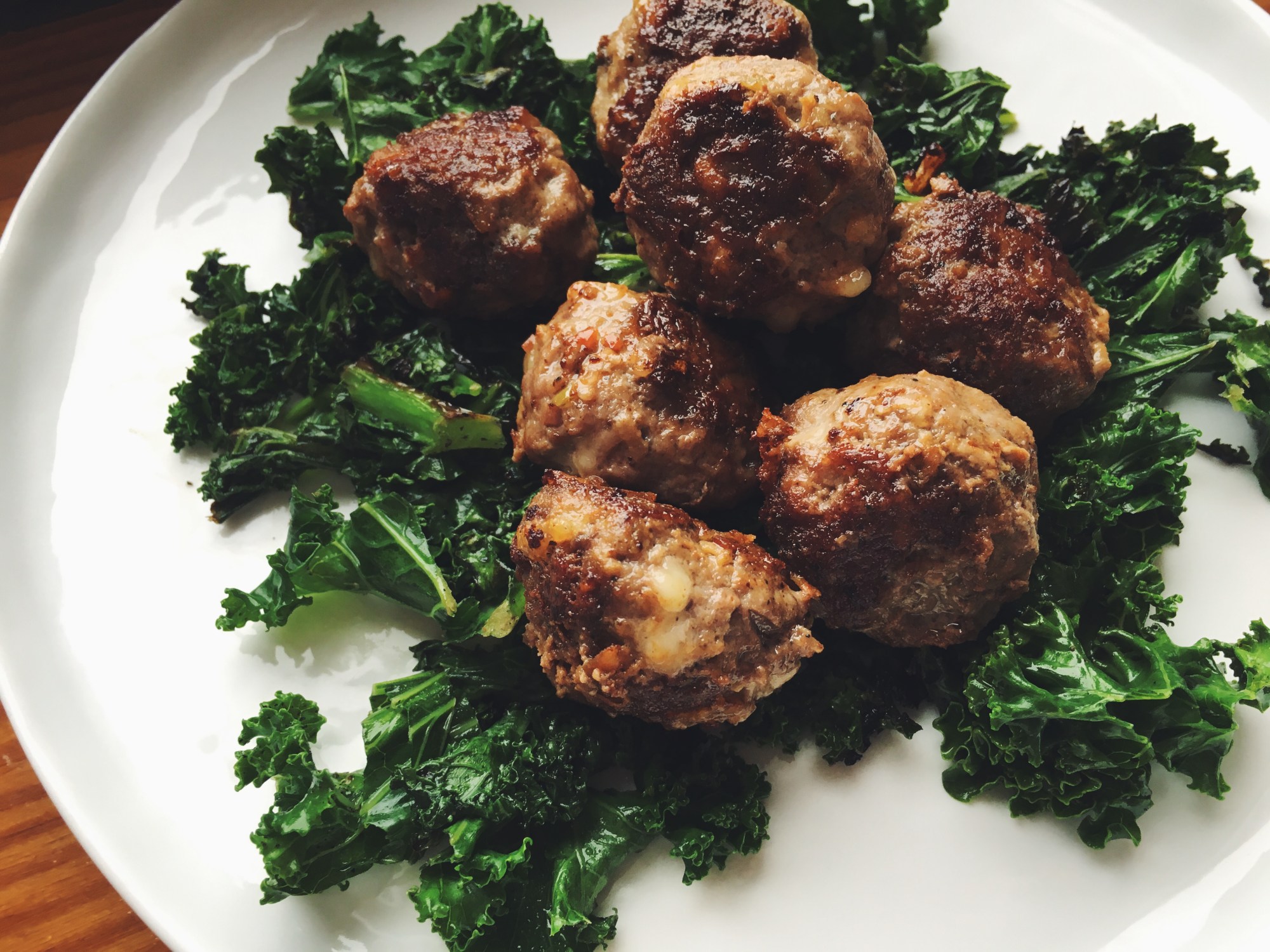 There you have it! Olive Parmesan Meatballs served on a bed of wilted kale!