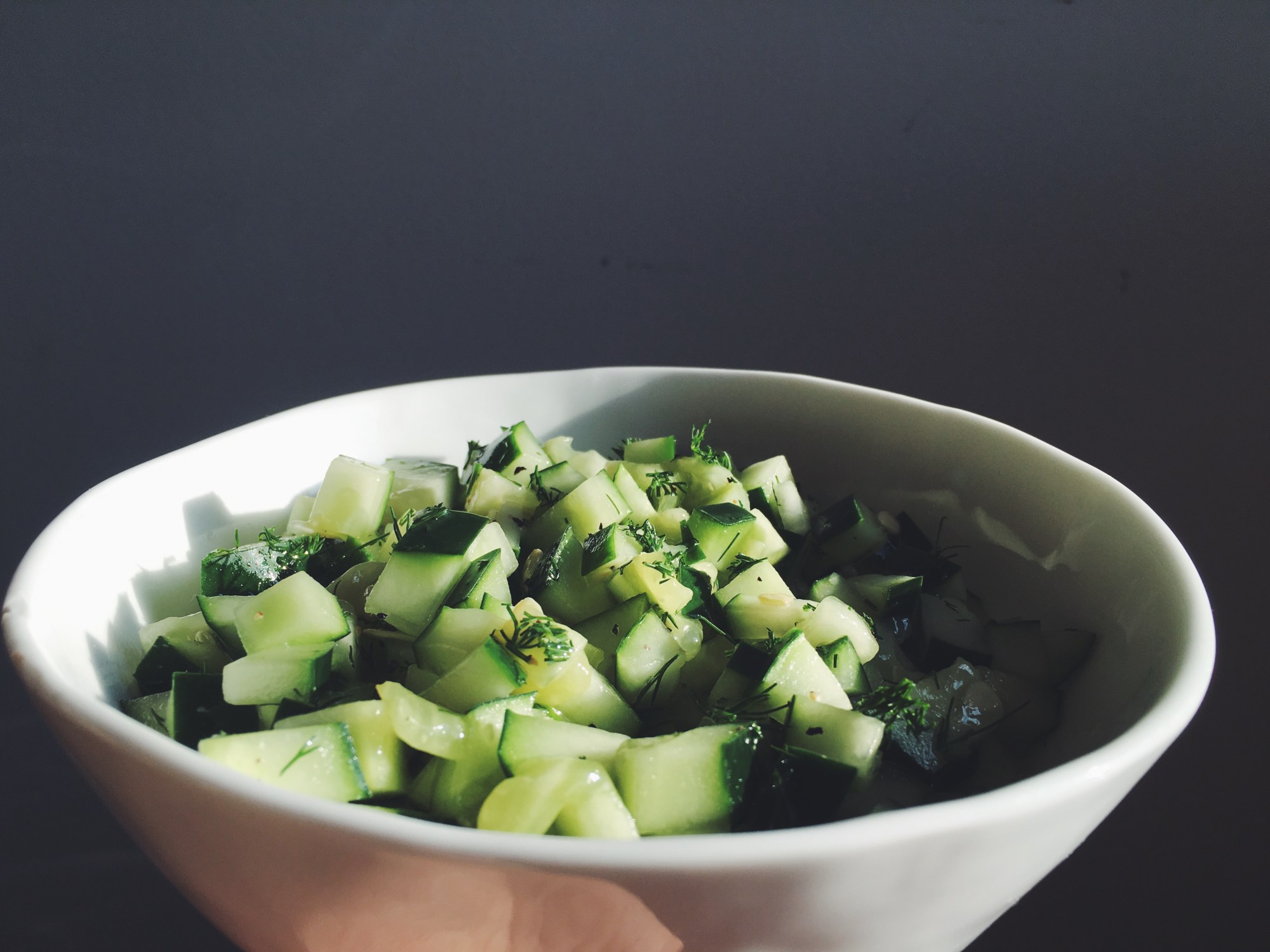 Last week, I bought fresh dill from the market and didn’t really know what to use it for. But these little cucumbers were sitting in their sale basket along the sidewalk, and it just made sense. They’re called “bush pickle cucumbers”. A crisp refreshing salad ensued! It’s actually quite simple. Cucumber, dill, vinaigrette.