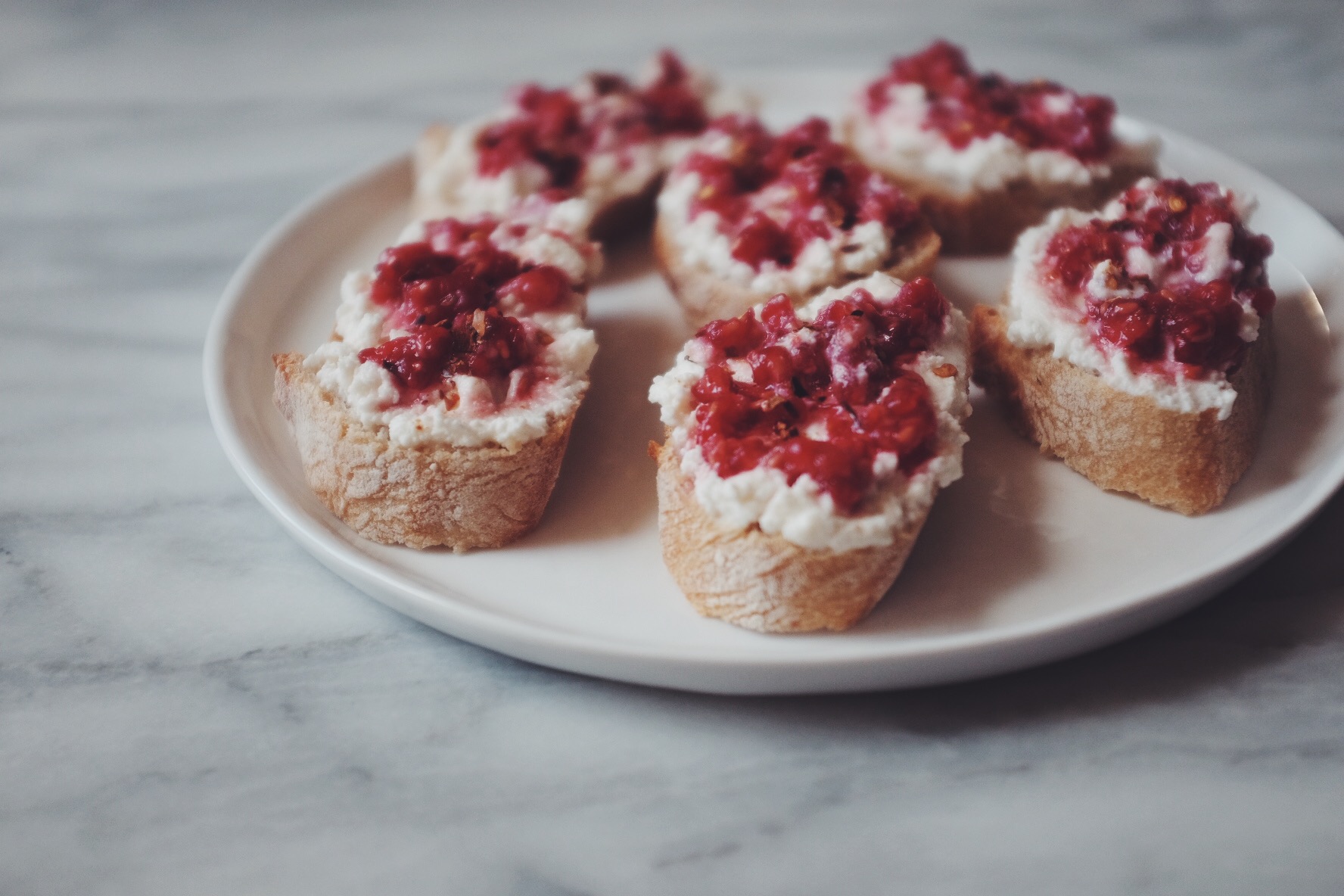 Creamy, berry, bites with a kick! These toasts are great for parties or even fancy brunch.