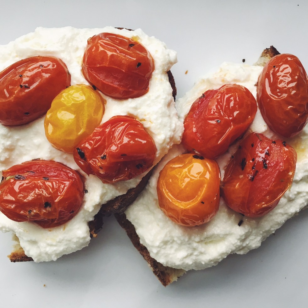 Pumpernickel Toasts with Honey Feta + Plum + Microgreens
